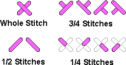 Fractional stitches (1/4, 1/2 and 3/4) are simply cross stitches with missing arms. They are used to provide a rounded look to a picture (1/4 and 3/4), or an airy look (1/2).