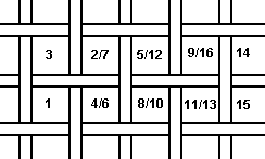 A second approach uses the Danish method of doing the bottom stitches first along a row, and completing the X's on the return trip. But to prevent the stitches rolling to the wrong side of the fabric a continental stitch is used rather than a half stitch. This looks like a half-stitch from in front, but the back is a long diagonal. For these diagrams, come up at the odd numbers and down at the even.